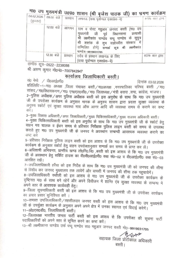 बस्ती। उत्तर प्रदेश के उपमुख्यमंत्री बृजेश पाठक का 04 फ़रवरी 2026 को बस्ती जनपद का दौरा प्रस्तावित है। अपने संक्षिप्त प्रवास के दौरान डिप्टी सीएम यहां एक निजी कार्यक्रम में सहभागिता करेंगे।
