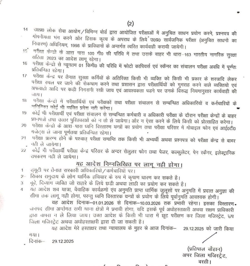 यह आदेश धारा 163 लागू बस्ती के अंतर्गत 1 जनवरी 2026 से लेकर 10 मार्च 2026 तक प्रभावी रहेगा। आवश्यकता पड़ने पर इसकी अवधि को बढ़ाया भी जा सकता है।