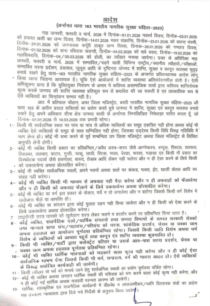 1 जनवरी से 10 मार्च 2026 तक बस्ती में धारा 163 लागू, धरना-प्रदर्शन पर 3 महीने की रोक