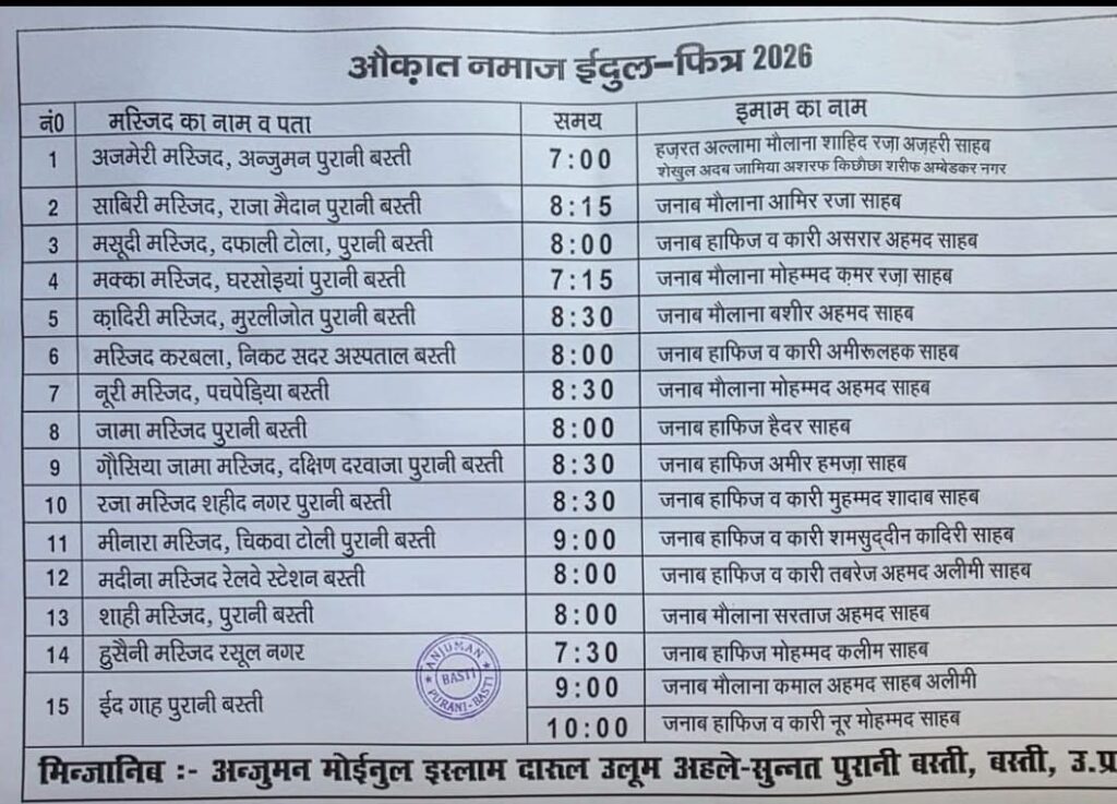 बस्ती में ईद-उल-फितर की नमाज़ का टाइम टेबल जारी, शांति व भाईचारे के साथ त्योहार मनाने की अपील