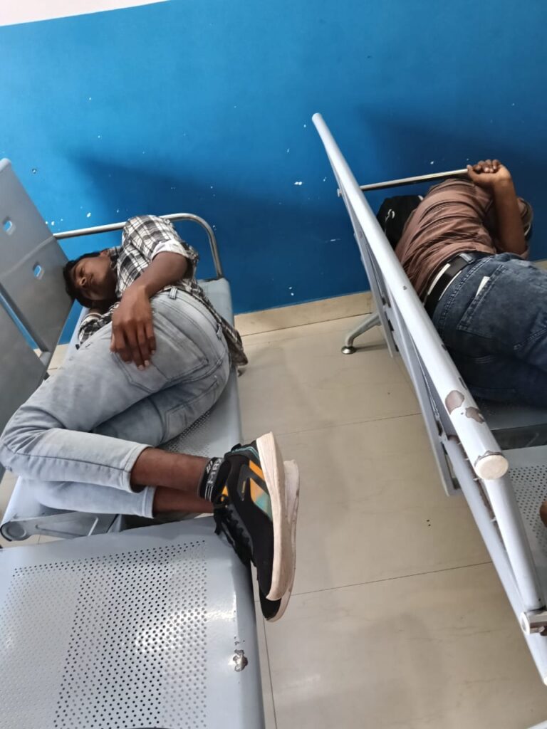 अस्पतालों में पर्याप्त वेटिंग एरिया न होने के कारण तीमारदारों को सीढ़ियों पर बैठने के लिए मजबूर होना पड़ता है। लंबी प्रतीक्षा के दौरान कई लोग वहीं सो जाते हैं। बैठने की व्यवस्था में सामाजिक दूरी का कोई पालन नहीं दिखता। मनोरंजन के नाम पर लगाए गए टीवी या तो बंद रहते हैं या सिर्फ अस्पताल का प्रचार प्रसारित करते हैं।