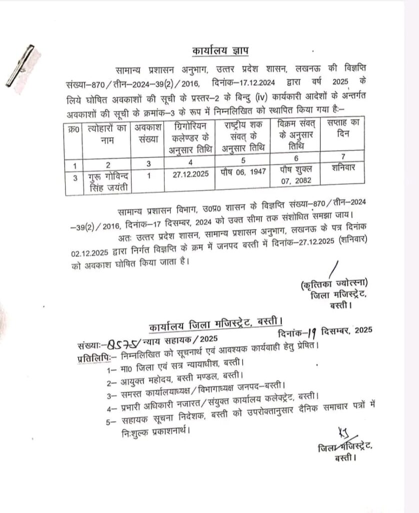 बस्ती। सिख धर्म के दशम गुरु, श्री गुरु गोविंद सिंह जी की जयंती के शुभ अवसर पर जनपद बस्ती में शनिवार, 27 दिसंबर को सार्वजनिक अवकाश घोषित किया गया है। जिलाधिकारी कृतिका ज्योत्सना (आईएएस) ने जानकारी देते हुए बताया कि यह अवकाश शासन एवं सामान्य प्रशासन अनुभाग द्वारा जारी निर्देशों के क्रम में घोषित किया गया है।