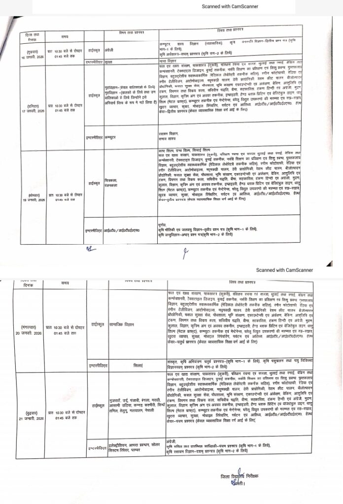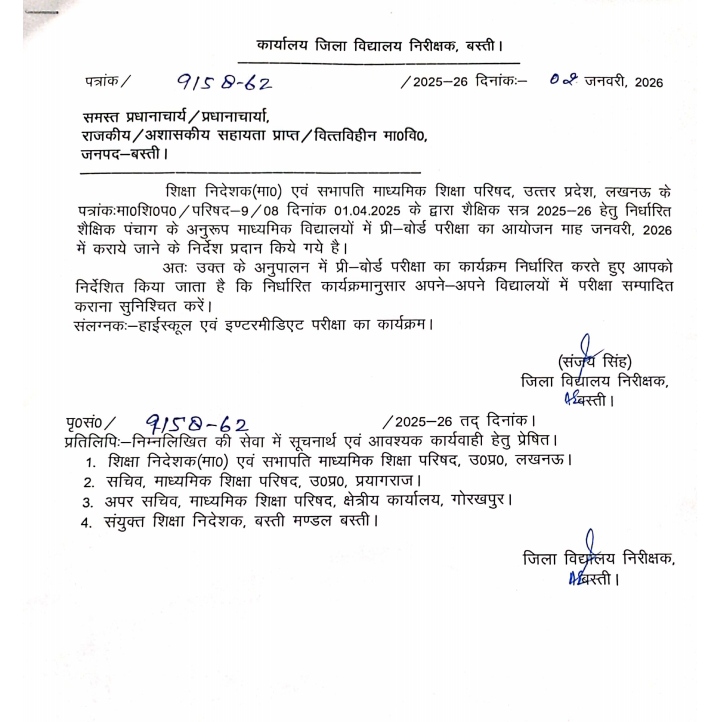 बस्ती। उत्तर प्रदेश माध्यमिक शिक्षा परिषद (यूपी बोर्ड) से संबद्ध विद्यालयों में कक्षा 10वीं एवं 12वीं की प्री-बोर्ड परीक्षाएं 7 जनवरी से 21 जनवरी 2026 तक आयोजित की जाएंगी। इसे लेकर स्कूल स्तर पर तैयारियां तेज़ कर दी गई हैं, वहीं छात्र-छात्राओं में भी परीक्षा को लेकर गंभीरता साफ़ दिखाई दे रही है।