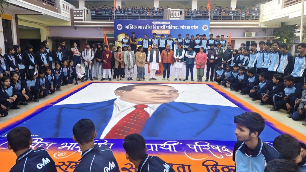 ABVP बस्ती द्वारा समरसता दिवस का भव्य आयोजन—850 वर्गफुट रंगोली और 500 छात्रों की सहभागिता से गूंजा परिसर